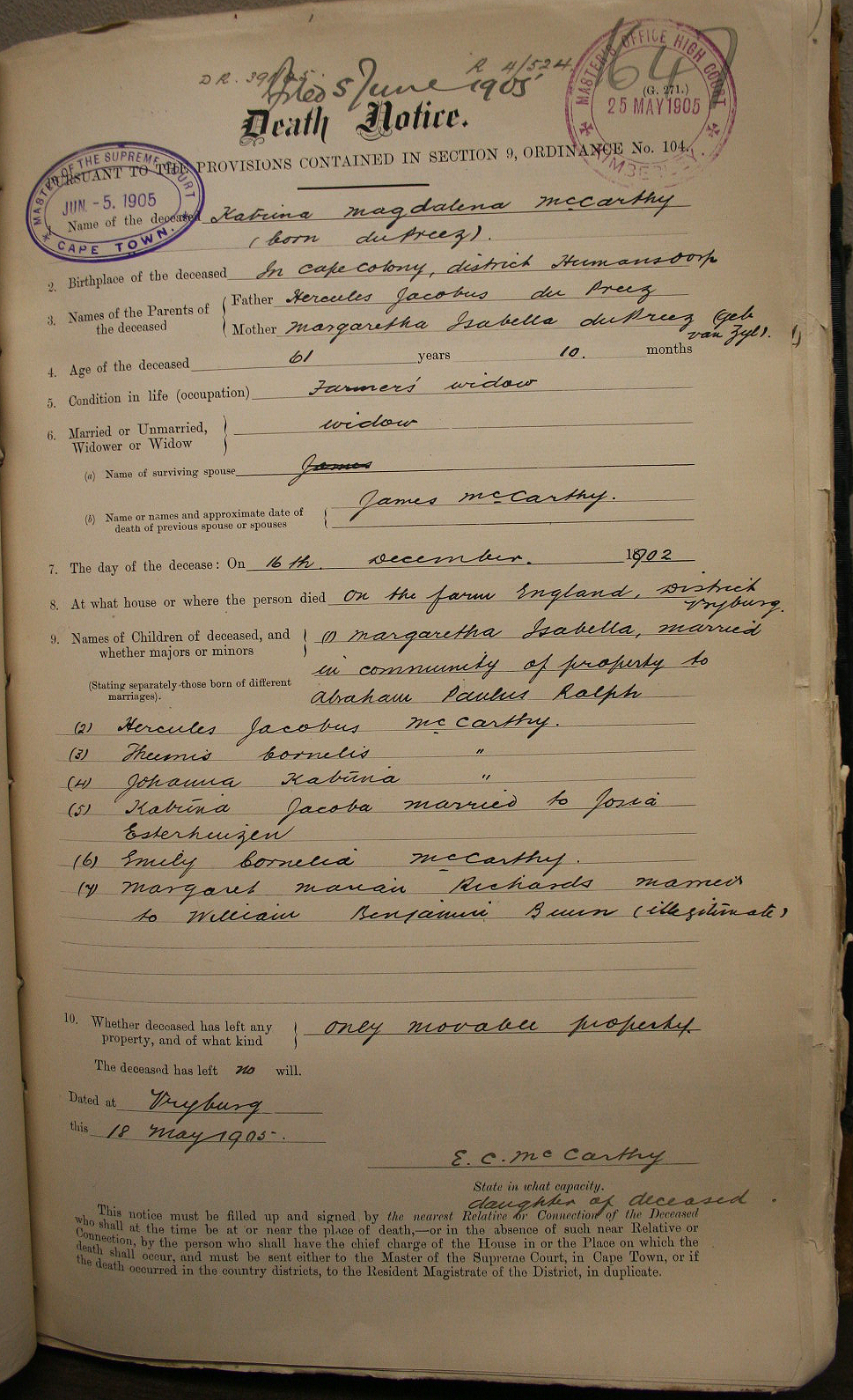 It is amazing how much data you get on these documents. Katrina Magdalena died on the 16 December 1902 as a widow in Vryburg on the farm England. She never got married again.